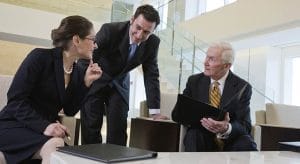 • Previous Team in lobby meeting to review paperwork with senior manager.